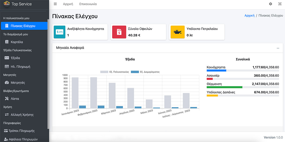 Σας ενημερώνουμε ότι, μέσω της εφαρμογής μας Top Enoikos, έχετε τη δυνατότητα να προβάλλετε και να εκτυπώνετε όλα τα ειδοποιητήρια κοινοχρήστων. Επιπλέον, μπορείτε να εξοφλείτε τις οφειλές σας με πιστωτική ή χρεωστική κάρτα και να έχετε πρόσβαση στα παραστατικά που τεκμηριώνουν τις επιμέρους χρεώσεις.